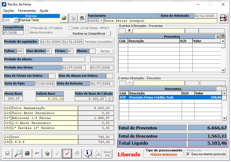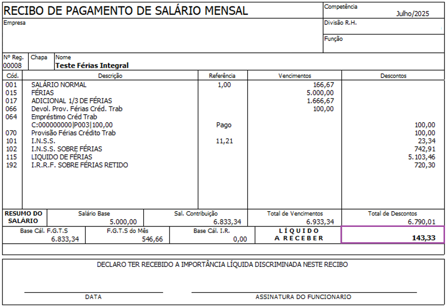 O valor provisionado não é um desconto real aplicado nas férias. Ele será efetivamente descontado no recibo mensal, e o valor previamente “reservado” será devolvido no mesmo recibo, garantindo o equilíbrio financeiro entre os pagamentos.