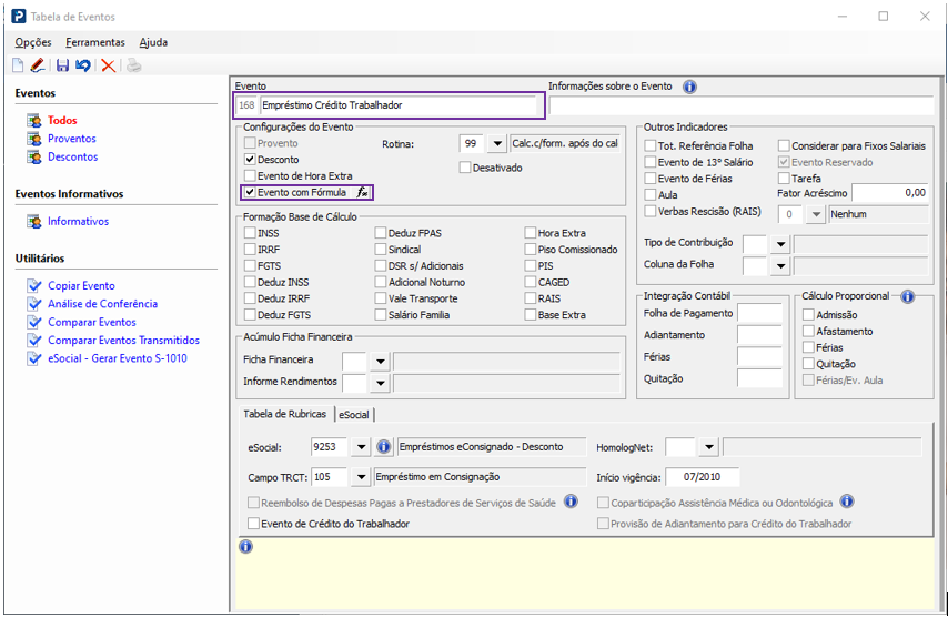 2 - Na tabela de eventos selecione o evento crédito de trabalhador.