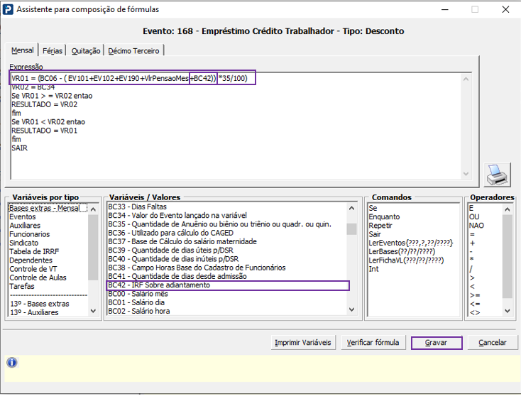 4 - Na 1ª linha onde consta VR01, adicione entre os parênteses a variável BC42, clique em gravar.