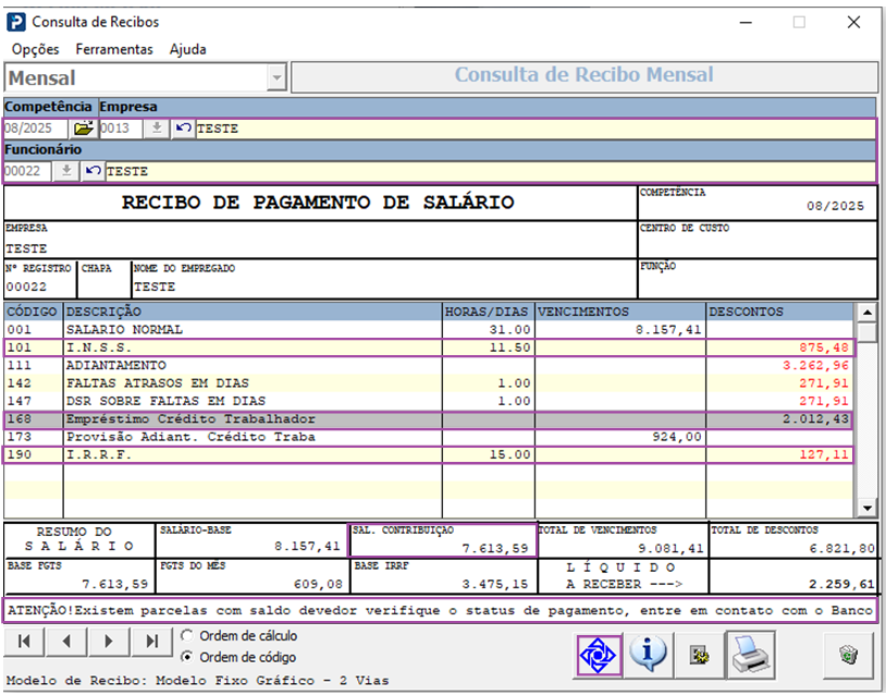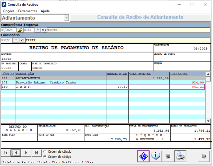 3 - Consulte o recibo de adiantamento do funcionário, e verifique o valor do IRRF descontado.