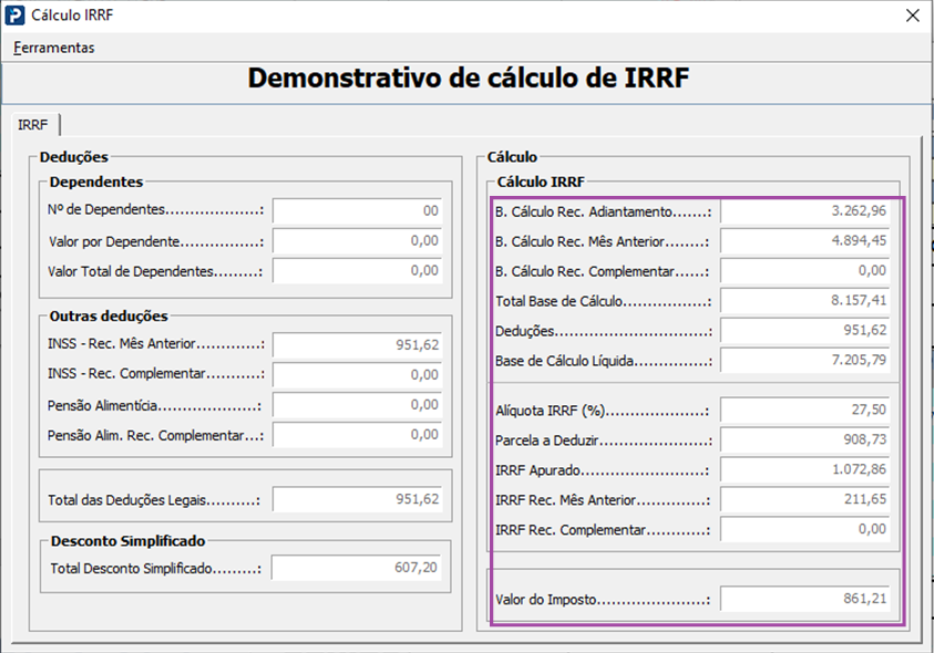IRRF do recibo de adiantamento 861,21