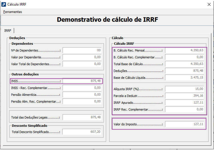 O valor de IRRF considerado no cálculo é: