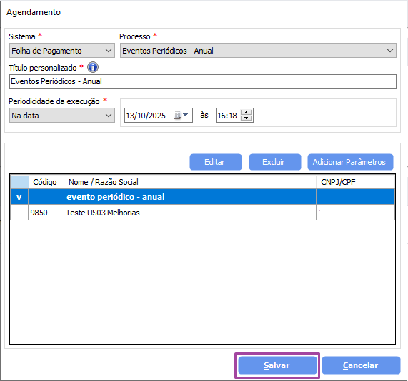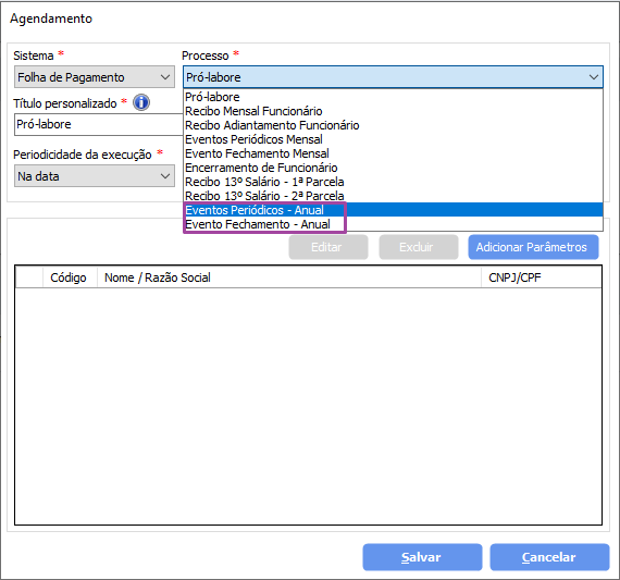 7 - Selecione o Processo Eventos Periódicos – Anual para o envio do evento S-1200 ou Eventos de Fechamento – Anual para o envio do evento S-1299 que deseja configurar para execução de forma automática.
