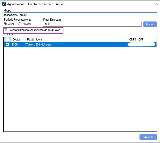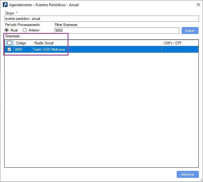 12 - Depois de selecionadas todas as empresas que serão utilizadas no processo basta clicar no botão “Adicionar” para que seja criado o agendamento para o grupo.