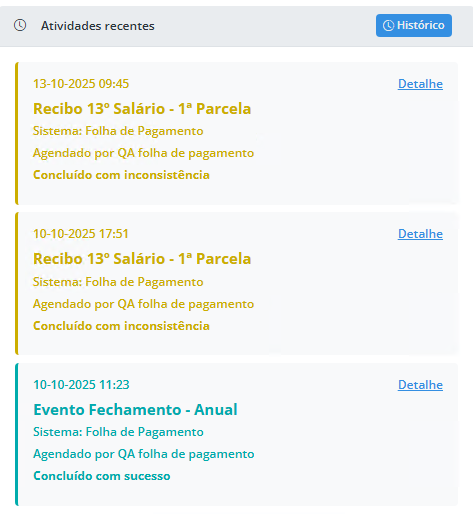 14 - Atividades recentes - Nessa coluna o usuário poderá verificar cada uma das solicitações e analisar o resultado final da atividade. Observe que a cor apresentada representa os status informados acima.