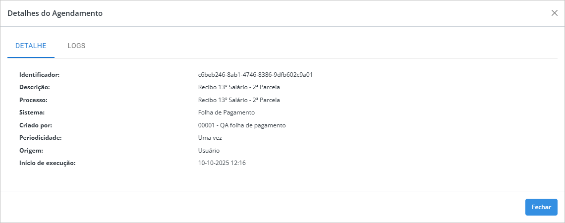 4 - Neste exemplo foi indicado que somente será visualizado no Dashboard os agendamentos da Folha de Pagamento, o processo de Recibo Mensal do Funcionário e somente os agendamentos realizados pelo usuário logado.