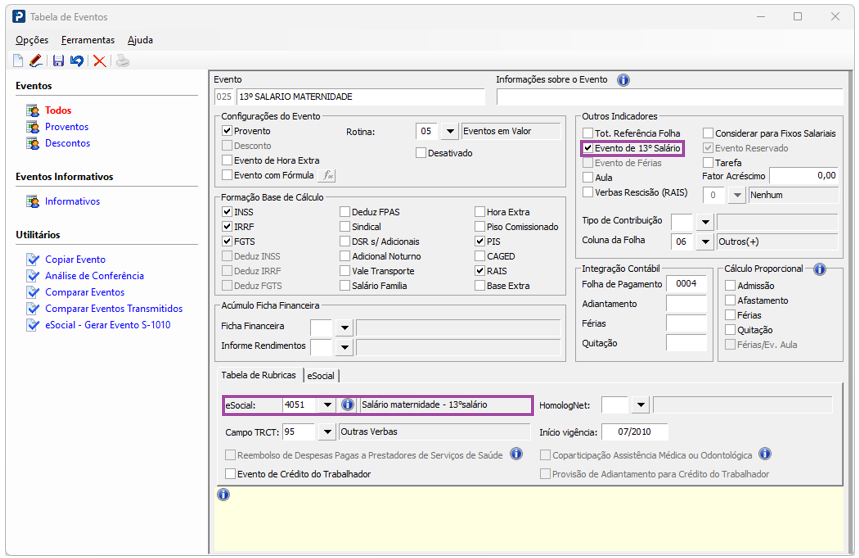3- Confirme se a rubrica eSocial está informada com o código 4051 – Salário Maternidade 13º Salário.