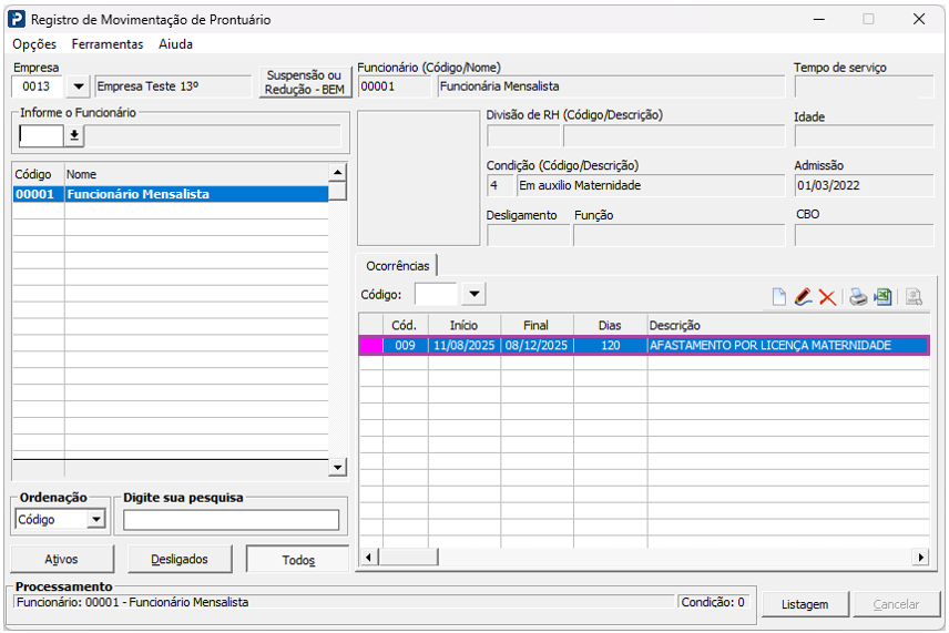 2- No exemplo abaixo, a funcionária esteve afastada por Licença Maternidade no período de 11/08/2025 a 08/12/2025.