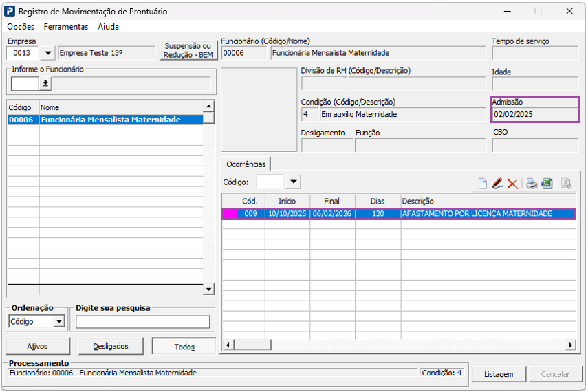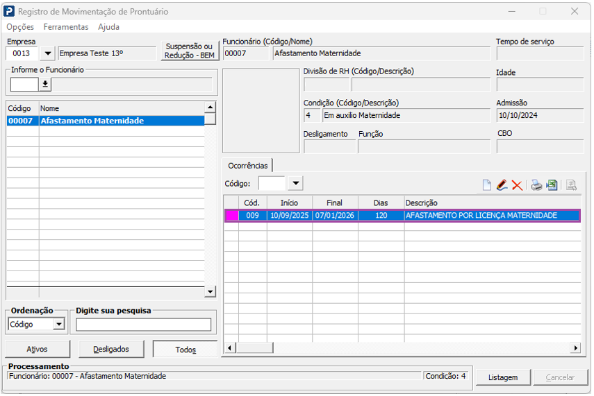 2- No exemplo abaixo, a funcionária esteve afastada por Licença Maternidade no período de 10/09/2025 a 07/01/2026.