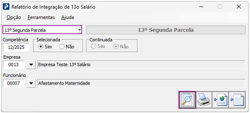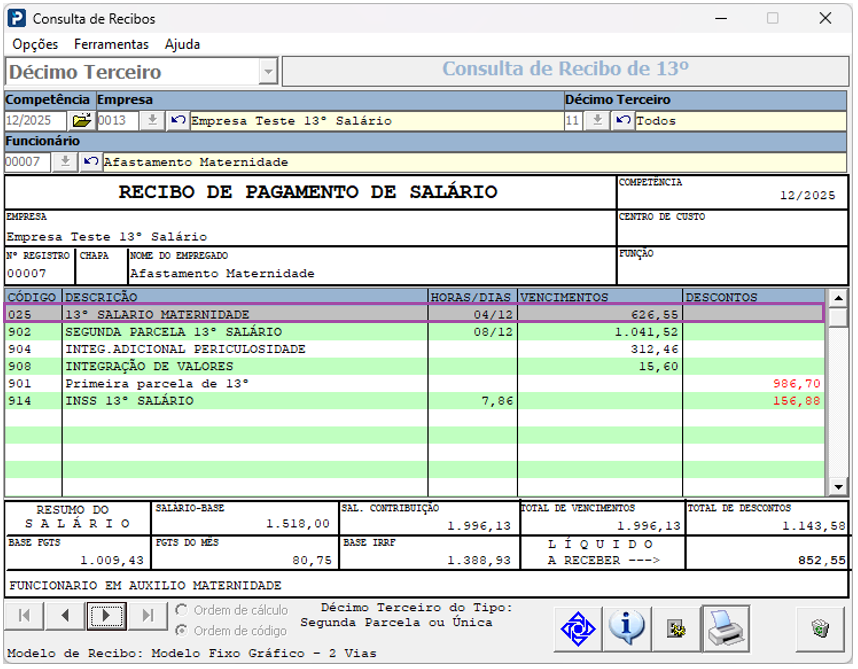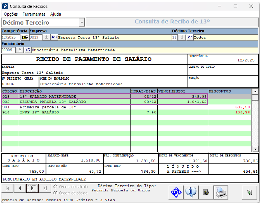 2- Após o processamento, acesse o recibo da segunda parcela do 13º salário para verificar as informações geradas.