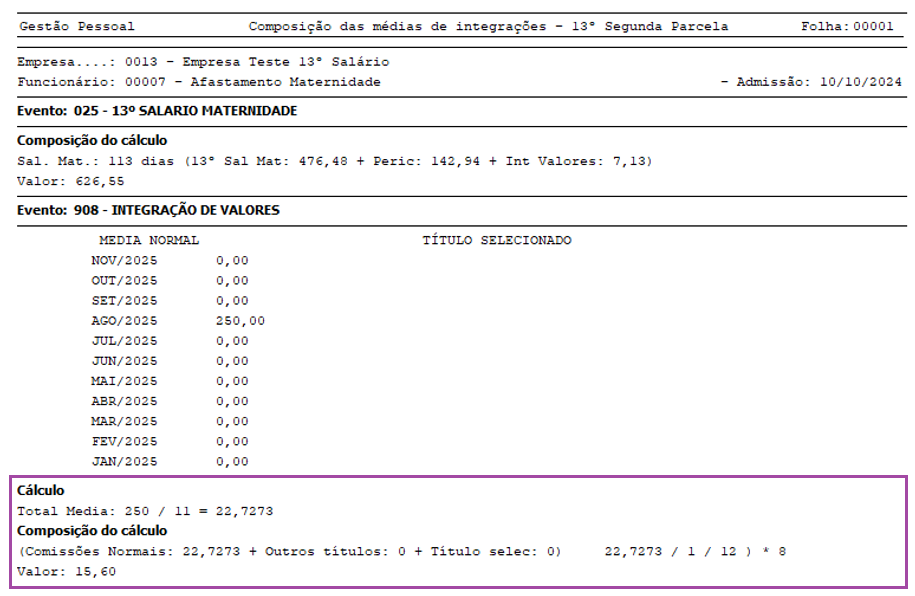 Para uma funcionária com 120 dias de afastamento no exercício de 2025, o cálculo do evento de 13º Salário Maternidade será realizado da seguinte forma: