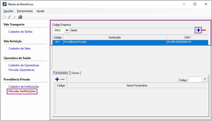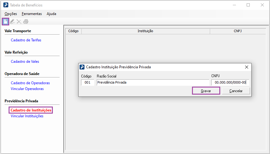 2- Realize o cadastro da Instituição que será declarada na guia Previdência Privada / Cadastro de Instituições.