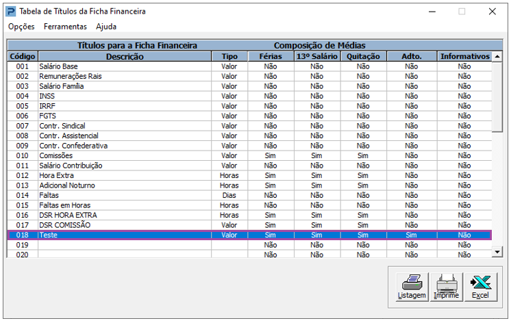 1- Acesse: Social > Folha de Pagamento > Tabelas > Tabelas Auxiliares > Tabela de Títulos da Ficha Financeira.