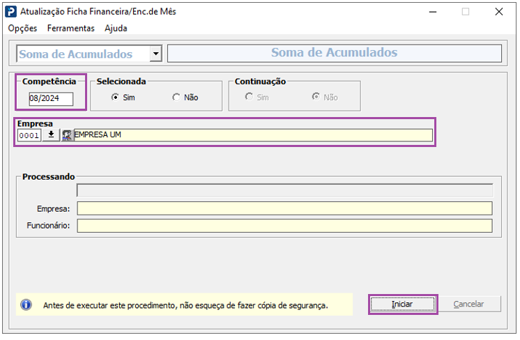 2- Realize a Soma de Acumulados mensalmente, após os procedimentos de emissão da folha de pagamento.