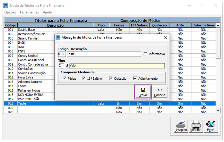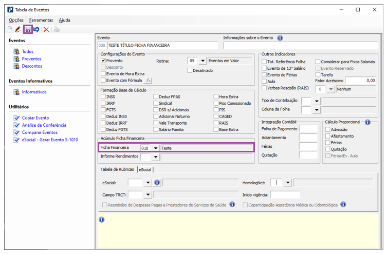 2- Selecione o evento que deve acumular na Ficha Financeira, no título que foi criado na Tabela de Títulos. No campo Ficha Financeira, selecione o código que foi criado, no exemplo utilizado, código 18.