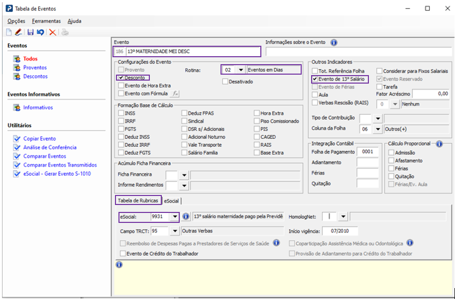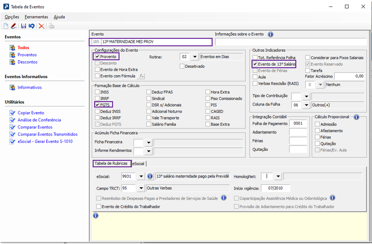 3 - Lance no gride de proventos e descontos os eventos criados acima com o valor dos Avos de 13º maternidade Mei. O evento deverá entrar como provento e sair como desconto apenas para calcular o FGTS.