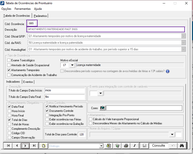 2 - Verifique se o afastamento maternidade foi lançado corretamente, na ocorrência criada especificamente para maternidade MEI. Não vincular o código 85 na aba parâmetros.