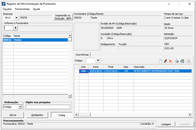1- Acesse: Social > Folha de Pagamento > Manutenção de Arquivos Funcionais > Registro de Movimentação de Prontuário