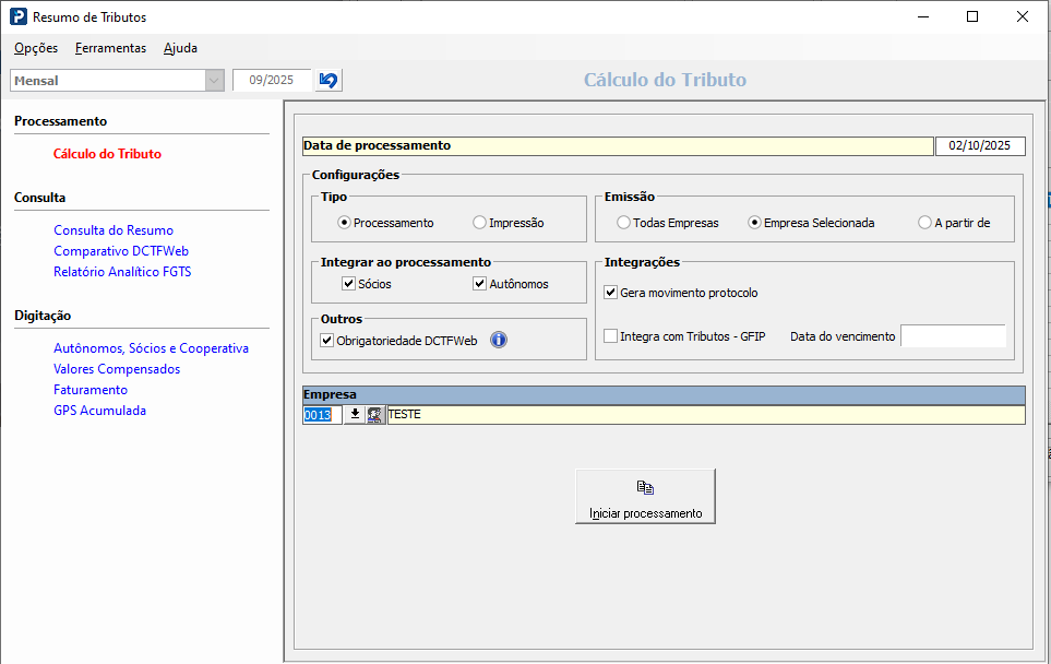 1 - Processe o resumo de tributos para competência.
