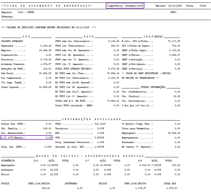 Processe a folha de pagamento e verifique que os valores de 1/12 avos de 13º maternidade não foram apresentados. Pois o pagamento é de responsabilidade do INSS, não devendo haver a dedução de FPAS 13º Maternidade.