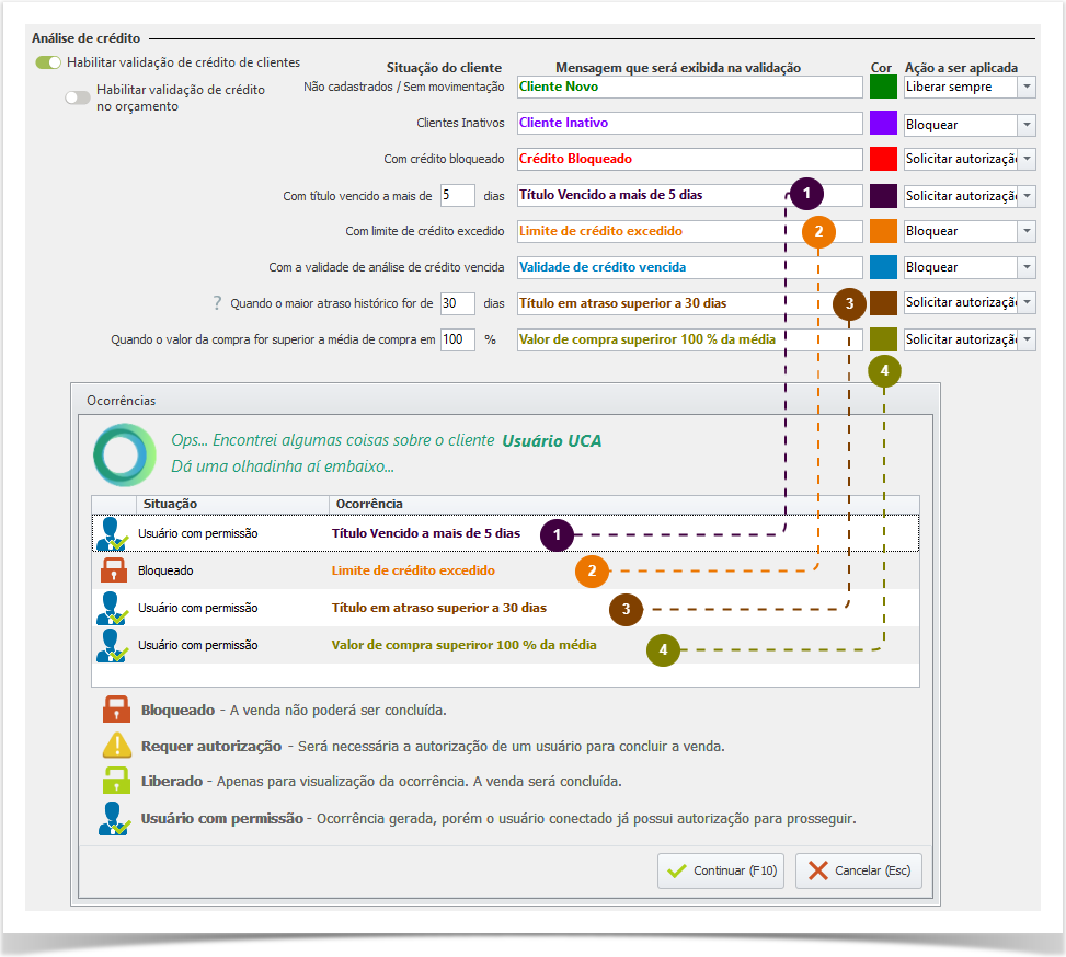 As ocorrências Título Vencido a mais de 5 dias, Título em atraso superior a 30 dias e Valor de compra superior 100% da média, nas configurações do Shop estão com ação definidas para Solicitar autorização e nas ocorrências, ao gravar a venda, as situações estão como Usuário com permissão.