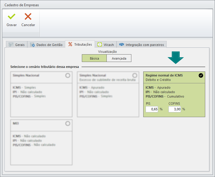 Caso opte pela visualização Básica, basta selecionar o cenário tributário que se aplica a sua empresa.