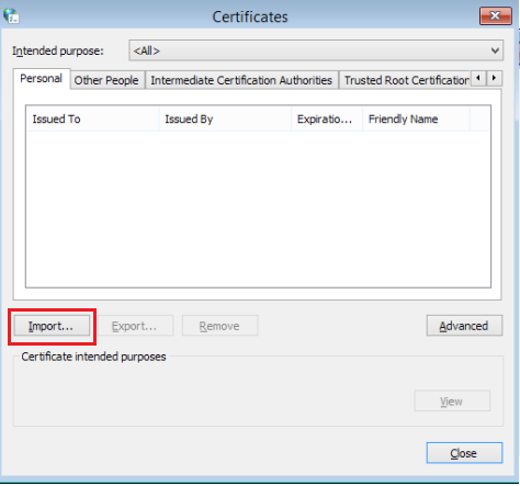 Na janela de Certificados, clique no botão "Import...". Isso abrirá o assistente de importação de certificado digital.