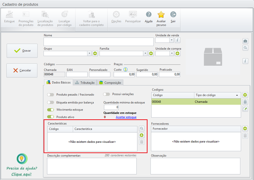 Esta seção de ajuda tem como objetivo orientar você a habilitar o campo de característica no cadastro simplificado de produtos no sistema. Essa configuração é útil quando você precisa inserir a característica do produto, mas o campo não está visível na tela de cadastro simplificado.