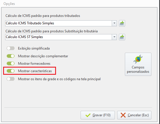 Além de "Mostrar características", você também pode marcar ou desmarcar outras opções disponíveis, como "Mostrar descrição complementar", "Mostrar fornecedores" e "Mostrar os itens da grade e os códigos na tela principal", para atender da melhor forma à sua necessidade.
