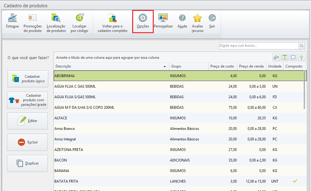 Acesse a tela de Cadastro de Produtos: No módulo inicial do cadastro de produtos, clique na opção "Opções".
