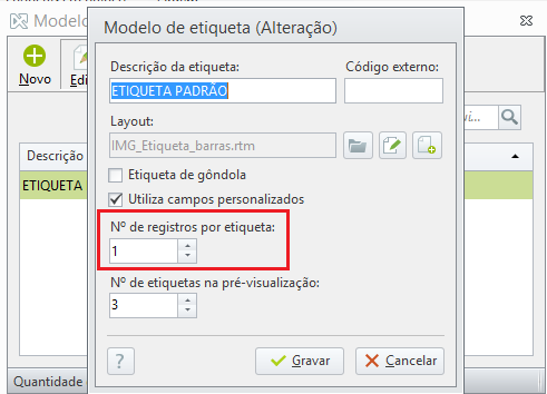 Para garantir que todos os itens selecionados sejam impressos corretamente , é necessário ajustar o campo "Nº de registros por etiqueta" no modelo de layout utilizado.
