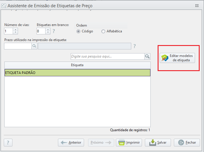 Na tela "Assistente de Emissão de Etiquetas de Preço" , localize e acesse a configuração do "Editar modelos de etiqueta" que você está utilizando para as etiquetas de gôndola.