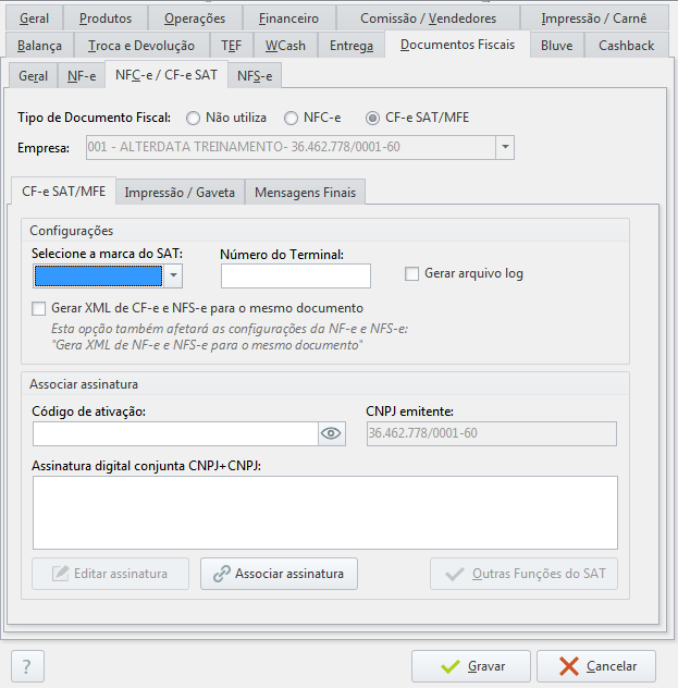 - Associar assinatura → depois que preencher o campo de Assinatura digital conjunta, clique neste botão para associá-la ao equipamento SAT/MF-e de sua empresa