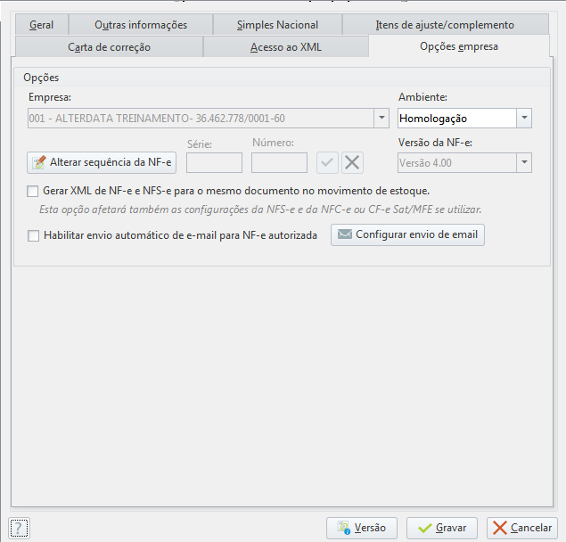 Opções empresa: - Empresa → o sistema preenche de forma automática com os dados do cadastro da sua empresa junto à Alterdata;