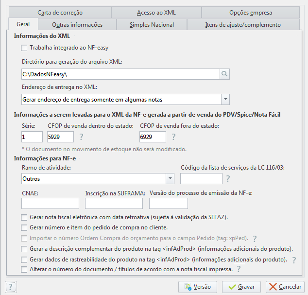 Aba Geral: - Trabalha integrado ao NF-easy → se a empresa usa o NF-easy(1) Alterdata para o envio da NF-e para a SEFAZ, marque esta opção;