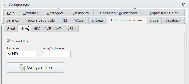 Em seguida, clique em Configurar NF-e. Nesta tela, temos duas abas principais para a emissão de NF-e. São elas: