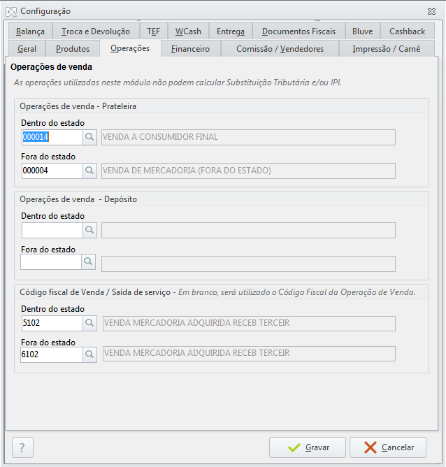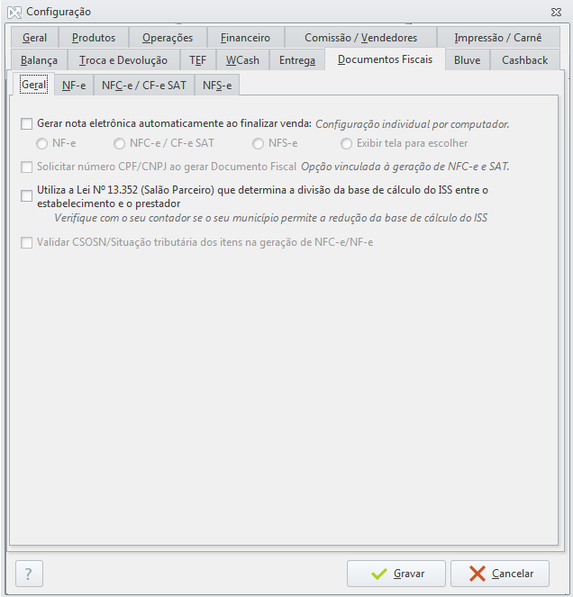 | Geral | Algumas opções desta aba só serão habilitadas se o sistema for configurado para emitir NFC-e pois estão diretamente relacionadas com este tipo de documento.