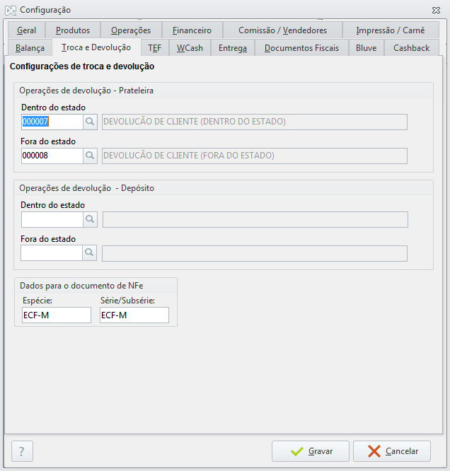 Semelhante ao que vimos no quadro anterior, aqui você seleciona as operações que devem ser usadas pelo sistema quando for lançada uma troca ou devolução no seu Nota Fácil.