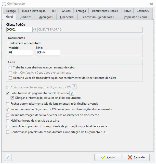 - Cliente padrão → selecione um cliente que será incluído na venda, sempre que nela não for selecionado um cliente específico. Esta opção é importante porque, no caso de documentos como o Cupom Fiscal Eletrônico por exemplo, a nota não pode ser emitida sem um nome de cliente;
