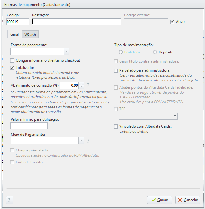 - Totalizador → a opção vem selecionada por padrão. Ela faz com que as movimentações registradas com esta forma de pagamento sejam totalizadas (somadas) quando emitir o relatório do caixa (relatório Resumo do Dia);