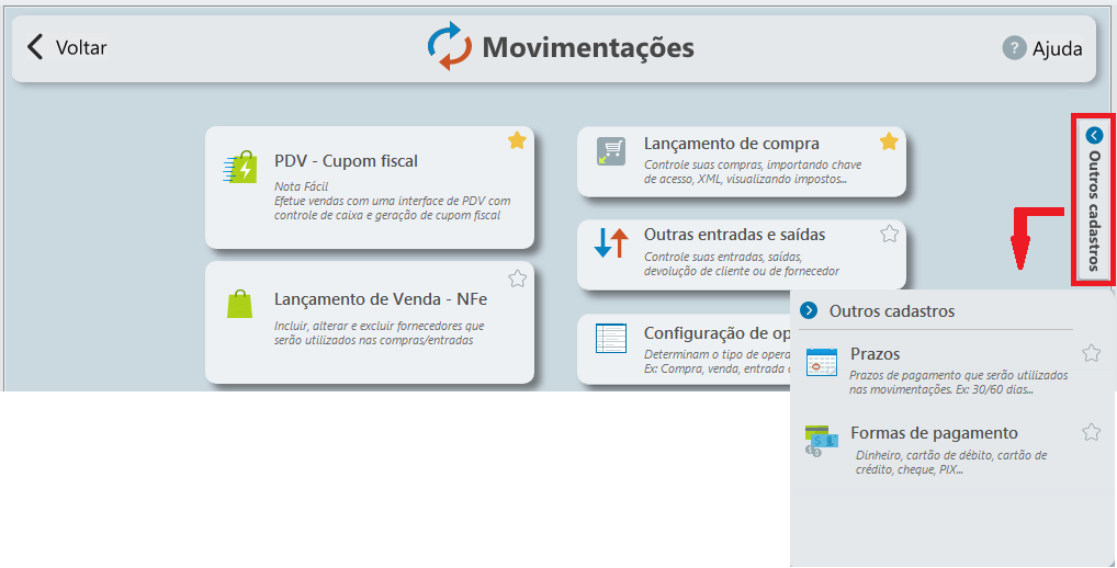 1- Acesse o cadastro clicando em Movimentações / Outros Cadastros / Formas de Pagamento: