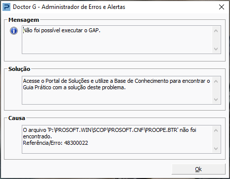 Página: A308 - Não foi possível executar o gap. O arquivo proope.btr não foi encontrado. Referênciaerro 48300022