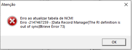 Página: A1754-Erro -2147467259 - The RI definition is out of syn [Btrieve Error 73] ao cadastrar novo NCM