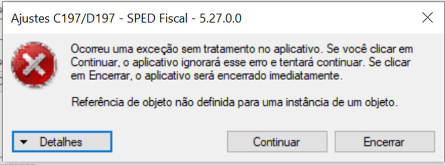Página: A1740 - Ajustes C197/D197 – Ocorreu uma exceção sem tratamento no aplicativo – Referência de objeto não definida para uma instância de um objeto.