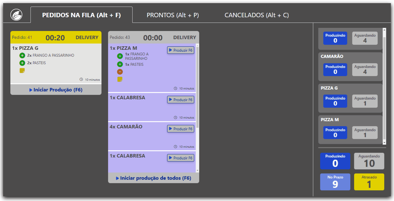 A diferenciação dos pedidos nas abas Pedidos na Fila (Alt+F), Prontos (Alt+P) e Cancelados (Alt+C) do KDS é feita por cores.