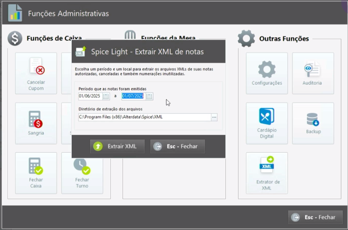 - O sistema exibirá as informações do período das notas fiscais e o local para extração.