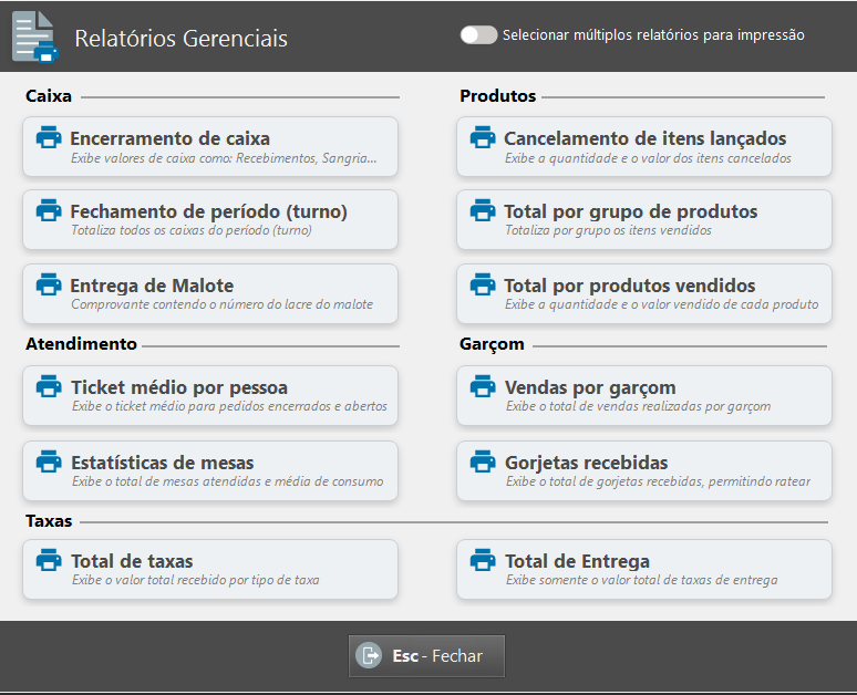 - O sistema apresentará a opção dos relatórios gerenciais, onde é possível imprimir o encerramento de caixa e o encerramento de turno.