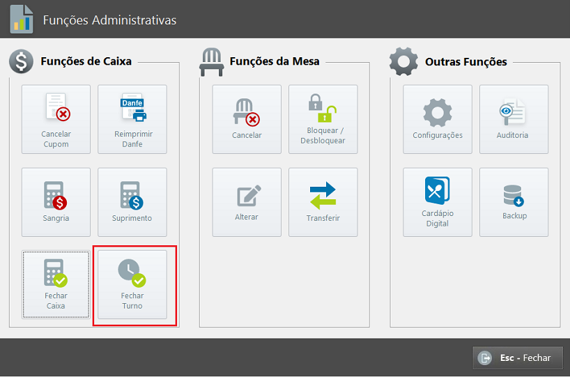 - Marque a opção para imprimir e, em seguida, feche. O caixa e o turno estarão encerrados, e a tela principal confirmará que não há turnos em aberto.