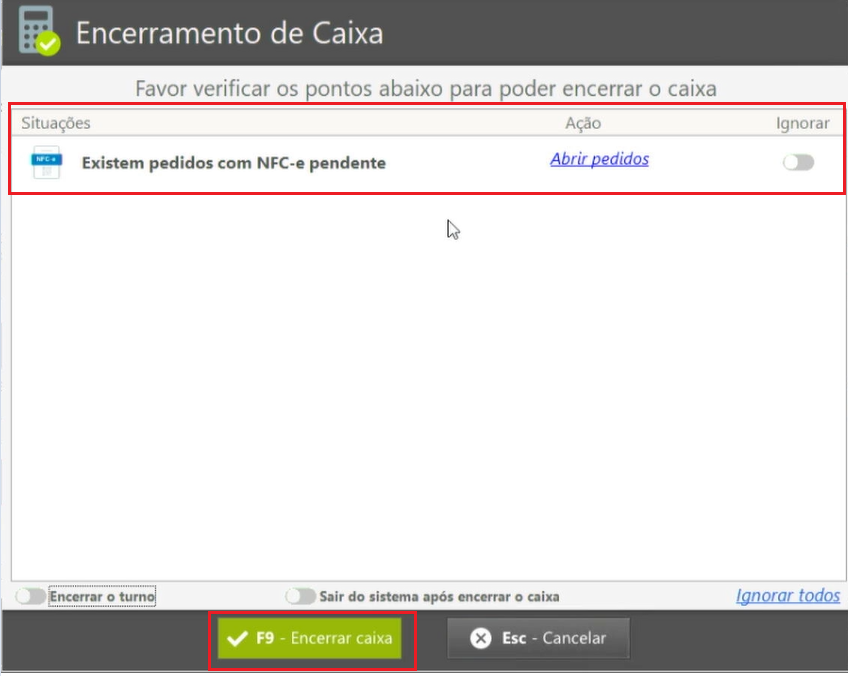 Se houver pendências (ex: pedidos com NFC-e não emitida, mesas não encerradas ou deliveries com status "não pago"), o sistema apresentará a opção para verificar.