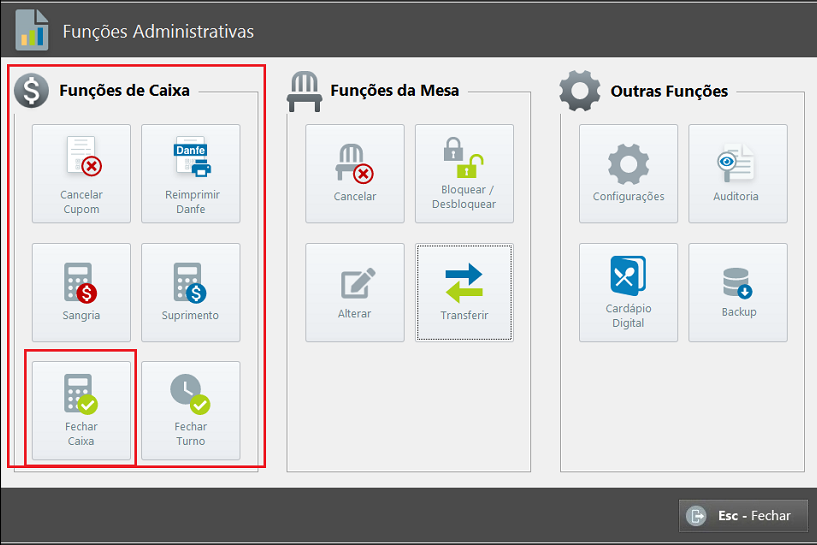 - Acesse Funções Administrativas: No lado esquerdo, encontram-se as principais funções do caixa, incluindo cancelamento, reimpressão de nota fiscal, sangria, suprimento, fechamento de caixa e fechamento de turno.